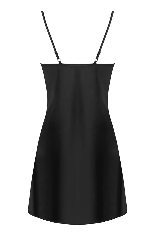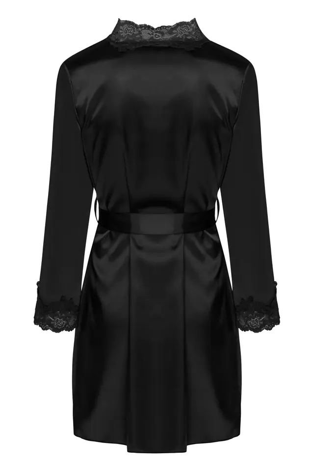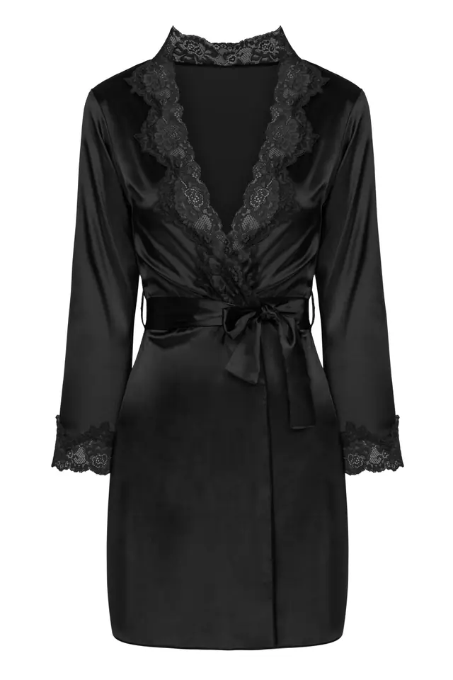 Wyjątkowo piękny komplet bielizny z połyskującej satyny w kolorze czarnym, to szlafrok z koszulką, sięgające do połowy uda. Przód i długie rękawy szlafroka wiązanego w talii paskiem zostały udekorowane śliczną koronką. Koszulka na cienkich, regulowanych ramiączkach, zdobiona przy biuście tą samą koronką. W komplecie stringi