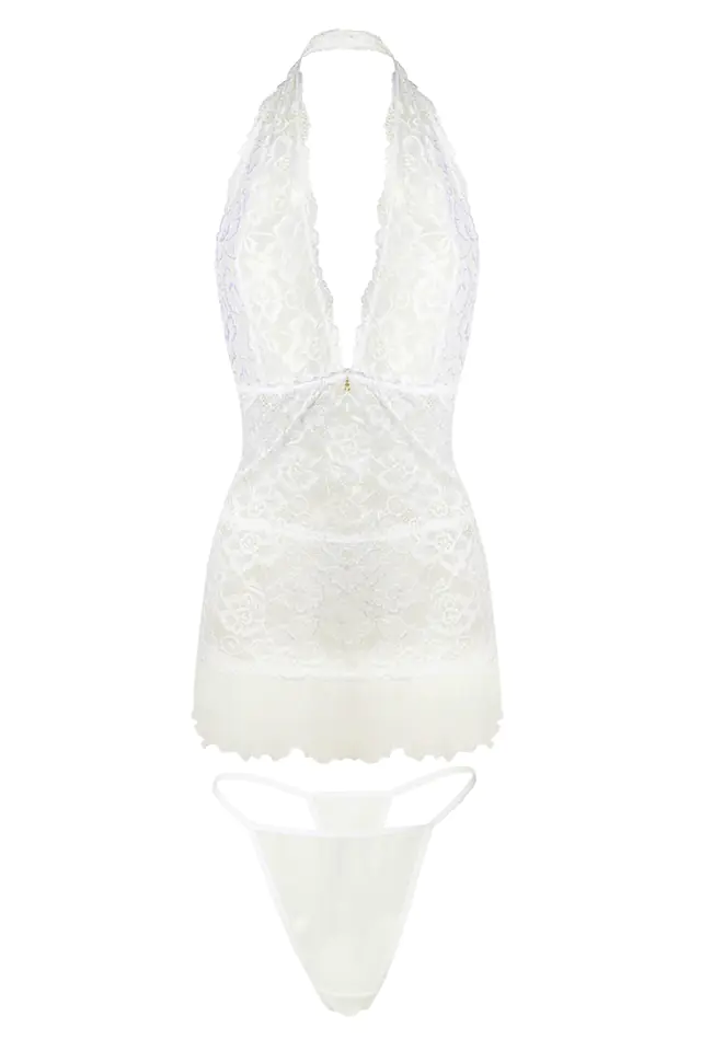 SEKSOWNY KOMPLET DWUCZĘŚCIOWY, W KTÓREGO SKŁAD WCHODZĄ KOSZULKA ORAZ STRINGI. KOSZULKA WYKONANA Z DELIKATNEJ KORONKI Z GŁĘBOKIM DEKOLTEM ZDOBIONY BIŻUTERYJNĄ SYMILKĄ. KOSZULKA JEST PRZEKŁADANA PRZEZ GŁOWĘ ORAZ WYKOŃCZONA TIULEM. DOSTĘPNE KOLORY: CZERWONY CZARNY, BIAŁY ORAZ ECRU.