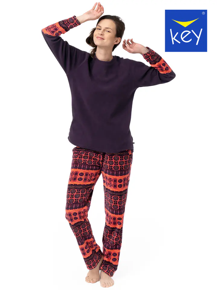 Piżama damska wykonana z miłej, przyjemnej i ciepłej dzianiny. Bluzka z długim ozdobnym rękawem wzorzyste, długie spodnie. Skład:100% poliester.