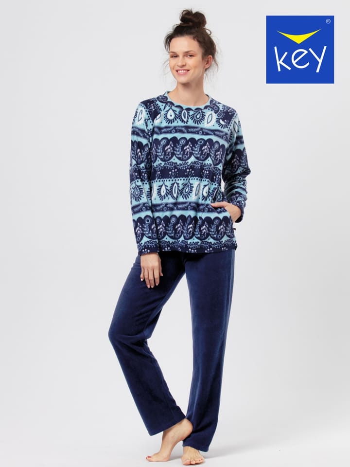 Zestaw typu homewear, w całości wykonany z miękkiego polaru. Bluza z kieszeniami bocznymi o klasycznym kroju, ozdobiona wzorem ludowym. Spodnie proste z miękką gumą w pasie. Skład : 100% poliester, strukturyzowana dzianina.