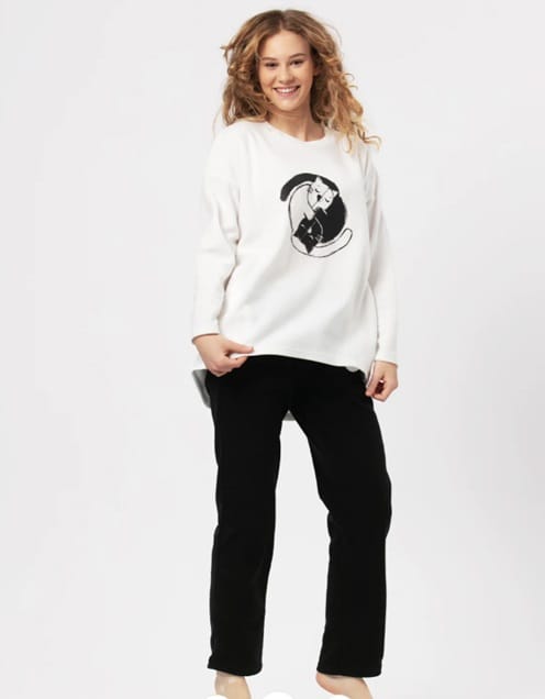 Miękki, bardzo ciepły komplet damski typu homewear. Zestaw składa się z wygodnej białej bluzy z lekko wydłużonym tyłem, ozdobionej z przodu. Spodnie mają klasyczną, prostą nogawkę i wygodne boczne kieszenie. Skład:100% poliester.