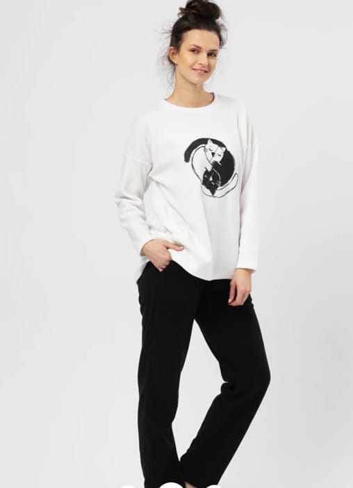 Miękki, bardzo ciepły komplet damski typu homewear. Zestaw składa się z wygodnej białej bluzy z lekko wydłużonym tyłem, ozdobionej z przodu. Spodnie mają klasyczną, prostą nogawkę i wygodne boczne kieszenie. Skład:100% poliester.