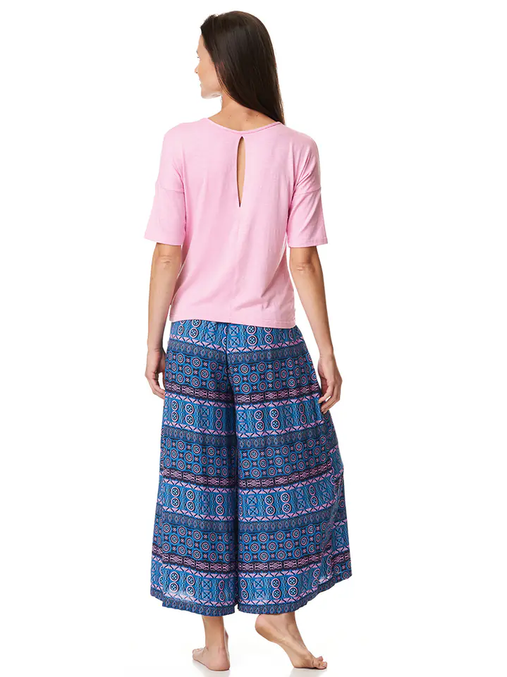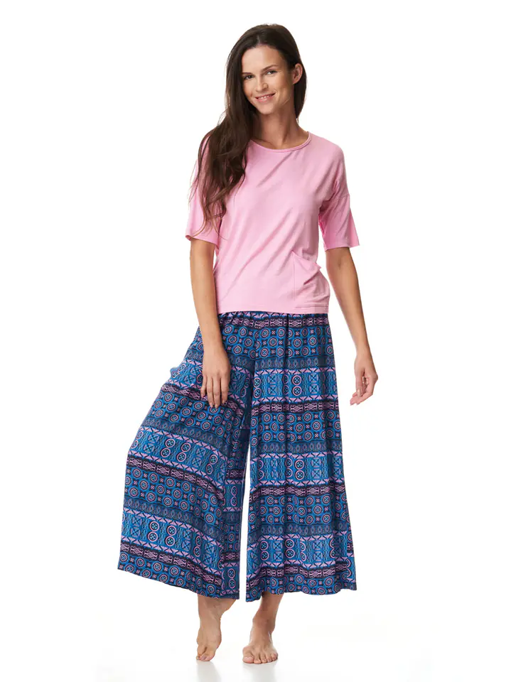 Komplet damski homewear wykonany z wysokiej jakości wiskozy. Bluzka luźna, gładka. Spodnie 7/8 wzorzyste, szerokie. Skład: 95% wiskoza, 5% elastan.