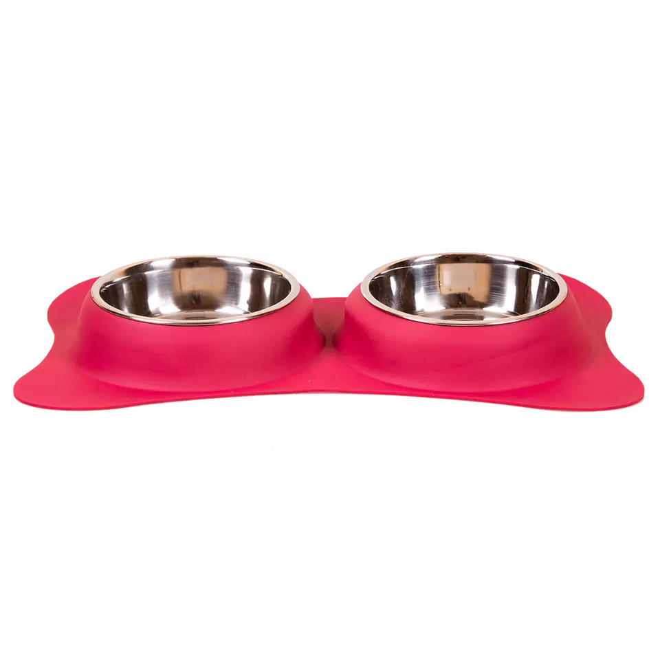 Komplet misek King, rozm. L Komplet zawiera dwie okrągłe, metalowe miski na sylikonowej podkładce o błyszczącym wykończeniu. Miski są łatwe w czyszczeniu - wystarczy wyjąć je z obudowy i umyć pod bieżącą wodą lub w zmywarce. Silikonowa mata z nieckami zapobiega przesuwaniu się misek, rozlewaniu wody i rozsypywaniu karmy. Produkt charakteryzuje się dużą starannością wykonania i wysoką jakością użytych materiałów. Materiał: stal nierdzewna i silikon Pojemność: 2 x 0,48 l Średnica: 42 cm Wysokość: 4 cm Kolor: różowy Miski dostępne są w trzech wersjach kolorystycznych: różowej, niebieskiej i brązowej.