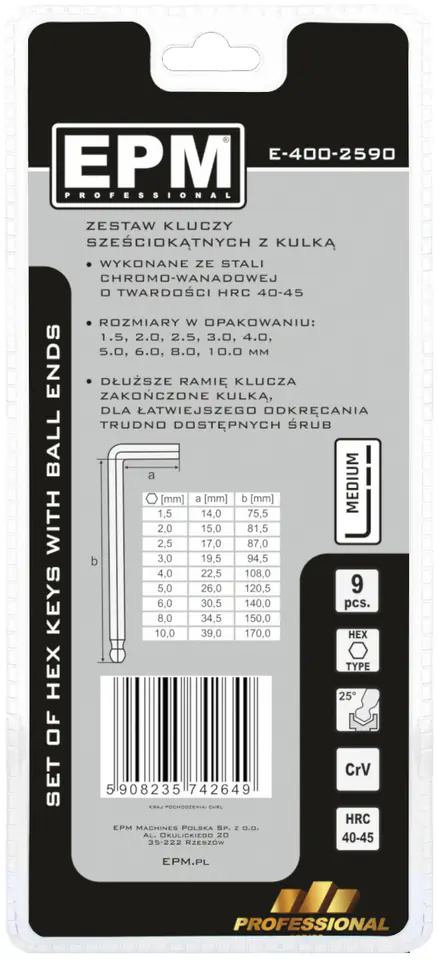 KOMPLET KLUCZY IMBUSOWY ''HEX'' TYP L 9SZT Z KULKĄ ŚREDNIE