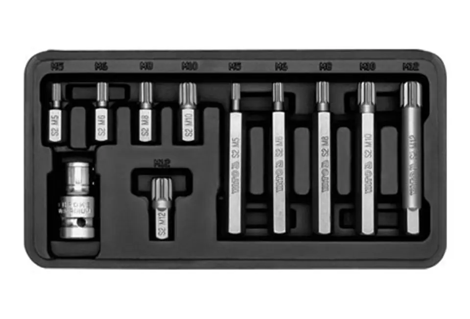 Profesjonalny zestaw bitów, służący do odkręcania śrub specjalnych typu: spline. Różnorodność bitów zapewnia możliwość wykonania wielu prac w specjalistycznych serwisach mechanicznych i samochodowych. Końcówki posiadają długość 30 oraz 75 mm, mocowane w uchwycie sześciokątnym 10 mm, dostosowanym do współpracy z grzechotką 1/2".Zestaw wykonany z najwyższej jakości stali stopowej narzędziowej S2, która charakteryzuje się: wysoką twardością HRC 58-62 jednolitą, drobnoziarnistą strukturą materiału odpornością na skręcanie wysokim momentem dokręcania - 21,8 Nm doskonałym zahartowaniem