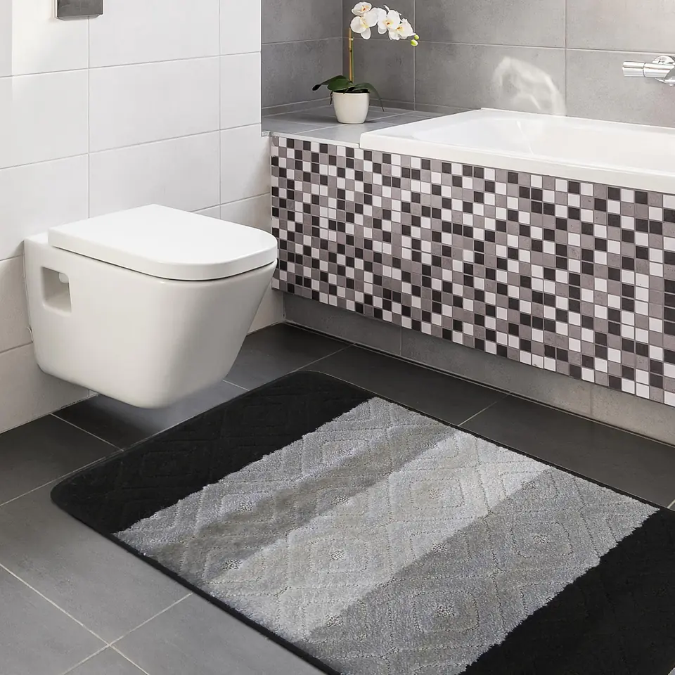 Wychodzenie z kąpieli stanie się dużo przyjemniejsze, jeśli przy prysznicu bądź wannie położymy komplet łazienkowy z kolekcji Montana. W skład kompletu wchodzą dwa dywaniki: 40x50 oraz 50x80. Czarno-szare dywaniki łazienkowe Montana wyposażone zostały w antypoślizgowy spód, dzięki któremu nie będą się one podwijały ani przesuwały. Gwarantuje to bezpieczeństwo podczas codziennego użytkowania. Dywaniki bardzo łatwo wyczyścić - można je prać w pralce, w temperaturze 30 stopni. Dostępne w wersji bez wycięcia pod toaletę.