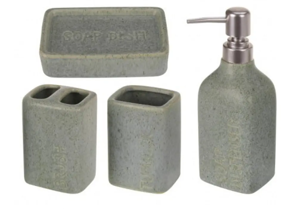 Komplet łazienkowy zestaw akcesoriów do łazienki Akcesoria łazienkowe które są niezbędne w każdej łazience wykonane z kamionki w kolorze ocieni zielenie z grawerowaniem.W skład zestawu wchodzi dozownik na mydło,mydelniczka, kubek na szczoteczki oraz kubek.Dane techniczne: Materiał:kamionka, Kolor:odcień zieleni, 1xdozownik na mydło 20x7,5x6,5 cm, 1xmydelniczka 12,5x8,5x3 cm, 1xkubek na szczoteczki 10,5x7,5x6cm, 1xkubek 10,5x8,5x3cm,