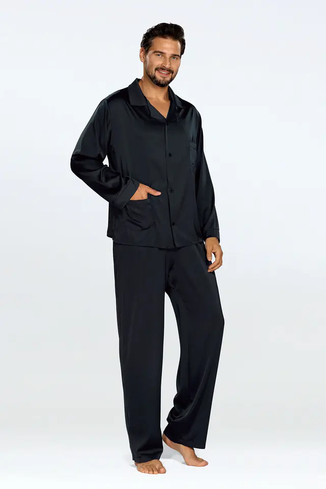 Nasza dwuczęściowa piżama męska to synonim elegancji i komfortu. Wykonana z najwyższej jakości satyny premium, jest niezwykle przyjemna w dotyku, a jednocześnie prezentuje się luksusowo i stylowo. Jej długie spodnie zapewniają doskonałą ochronę i ciepło w chłodniejsze noce, dzięki czemu będziesz spał w pełnym komforcie. Góra piżamy Lukas składa się z zapinanej luźnej koszuli na długi rękaw z kieszonką u góry i na dole. Ten najmodniejszy krój zachwyci każdego mężczyznę.