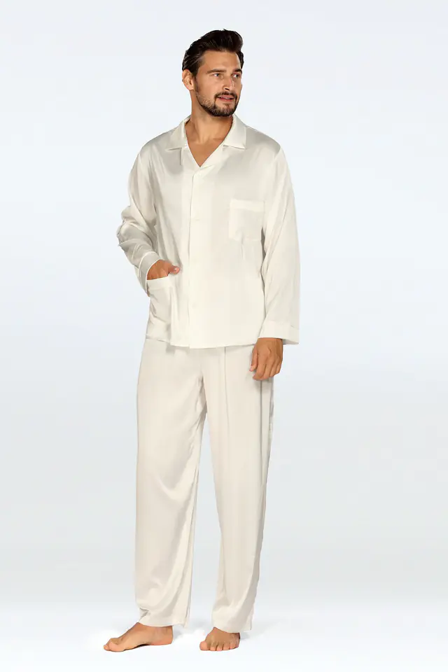 Nasza dwuczęściowa piżama męska to synonim elegancji i komfortu. Wykonana z najwyższej jakości satyny premium, jest niezwykle przyjemna w dotyku, a jednocześnie prezentuje się luksusowo i stylowo. Jej długie spodnie zapewniają doskonałą ochronę i ciepło w chłodniejsze noce, dzięki czemu będziesz spał w pełnym komforcie. Góra piżamy Lukas składa się z zapinanej luźnej koszuli na długi rękaw z kieszonką u góry i na dole. Ten najmodniejszy krój zachwyci każdego mężczyznę.