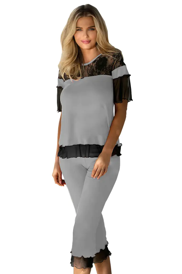 NIEZWYKLE WYGODNA I PRZYJEMNA PIŻAMKA WYKONANA Z DELIKATNEJ WISKOZOWEJ TKANINY. GÓRA TO KOSZULKA Z KRÓTKIM RĘKAWEM Z DODATKIEM TIULOWYCH FALBANEK ORAZ DELIKATNEJ KORONKI. DÓŁ TO KOMFORTOWE W NOSZENIU SPODENKI.