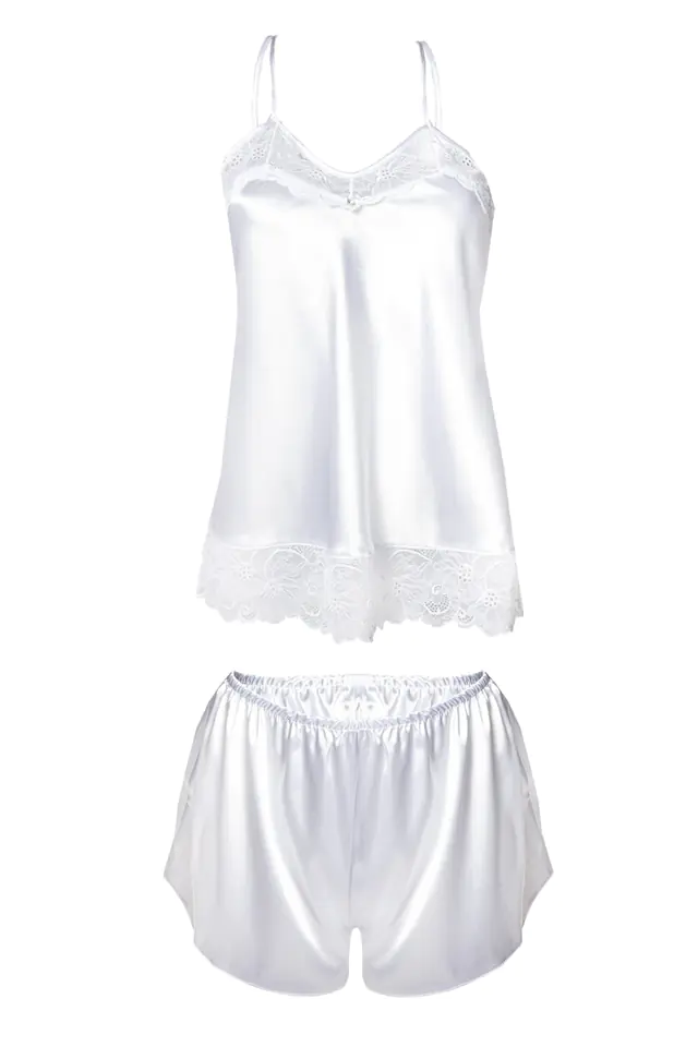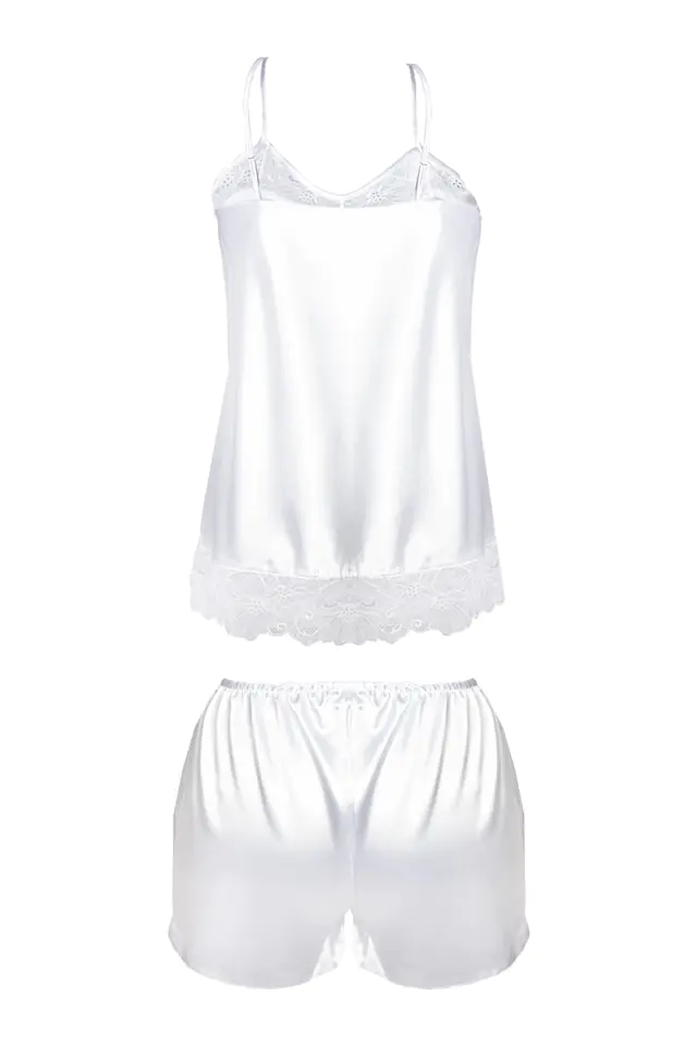 Komplet składa się z koszulki z delikatną koronką. Ramiączka cienkie regulowane. Spodenki krótkie satynowe gładkie. Delikatna kompozycja w odcieniu bieli.