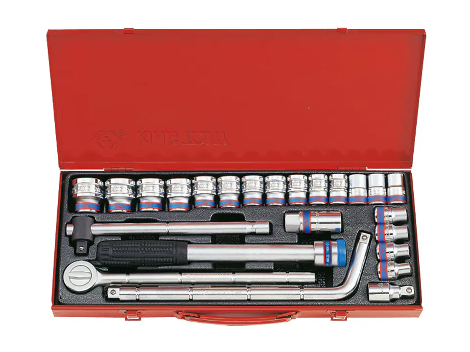 W zestawie znajdują się nasadki krótkie, 12-kątne, nasadka do świec 21mm 12-kątna, grzechotka wraz z przedłużką do grzechotki, pokrętło przesuwne oraz pokrętło typu L. Nasadki w rozmiarach [mm]: 10, 11, 12, 13, 14, 15, 16, 17, 18, 19, 20, 21, 22, 23, 24, 27, 30, 32.