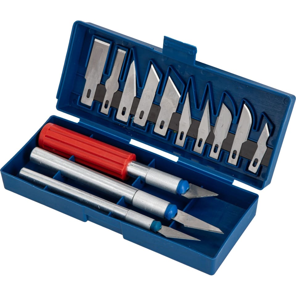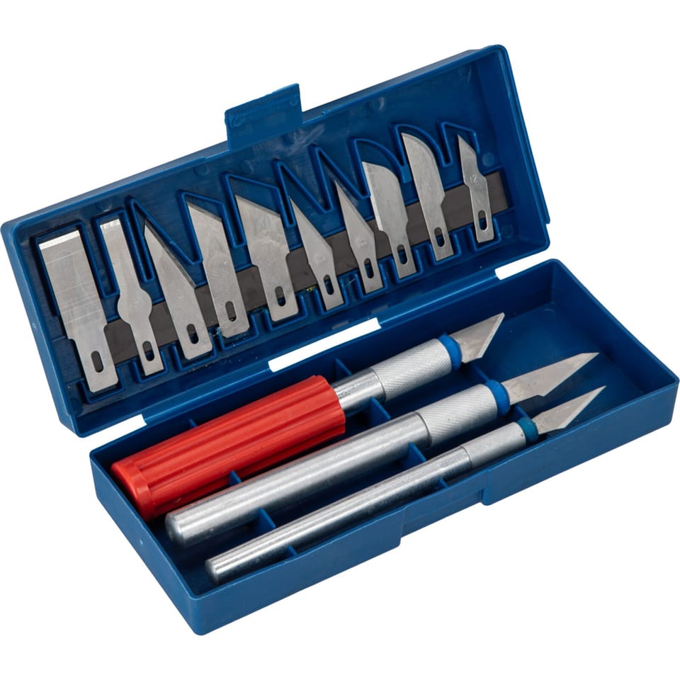 - Zestaw 3 rękojeści – 8 i 11 mm oraz 11 mm z nasadką plastikową z 13 ostrzami wymiennymi różnego kształtu do różnorodnych prac: modelarskich, w drewnie itp.