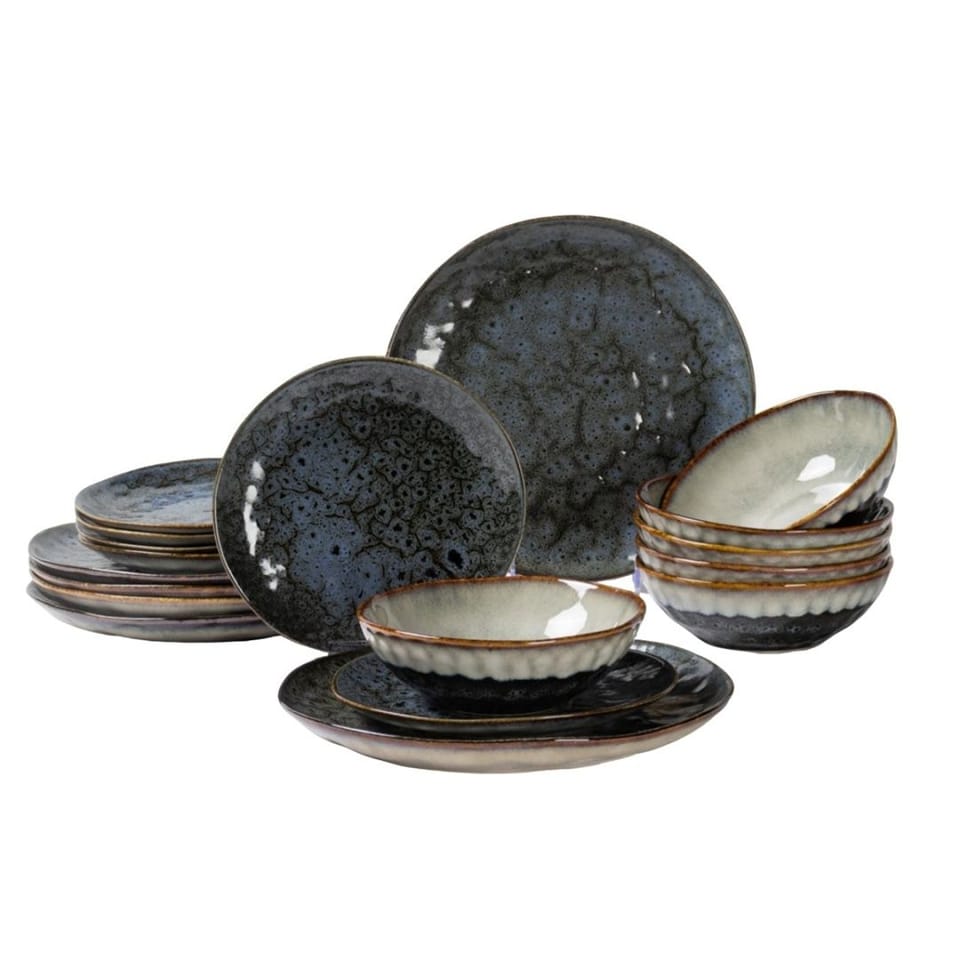 Odkryj wyjątkową kolekcję naczyń ceramicznych NAVY GREY OMBRES, która wniesie na Twój stół powiew rzemieślniczej elegancji i tajemniczości nocnego nieba. Każdy element tego zestawu został starannie wykonany, aby podkreślić piękno naturalnej kamionki i zachwycić unikalnym efektem cieniowania. Charakterystyczna struktura OMBRE płynnie przechodzi od głębokich, niemal czarnych tonów, przez tajemnicze granaty, aż po subtelne, rozjaśnione szarości i kremy na brzegach i we wnętrzach niektórych elementów. Ta gra kolorów, połączona z delikatnie młotkowaną organiczną fakturą powierzchni, nadaje każdemu naczyniu niepowtarzalny, rzemieślniczy charakter. Idealnie sprawdzą się podczas rodzinnych obiadów, kolacji z przyjaciółmi czy dodając każdemu posiłkowi odrobinę artystycznego wyrazu. Zestaw ten to doskonała propozycja dla osób ceniących sobie oryginalny design, naturalne materiały i piękno inspirowane naturą. Wprowadź do swojej jadalni atmosferę spokoju i wyrafinowanego smaku z kolekcją NAVY GREY OMBRES. Każdy produkt z tej serii cechuje się unikalnym wyglądem, ponieważ żadne dwa elementy nie są identyczne. Dzięki zastosowaniu specjalnej techniki barwienia, kolory harmonijnie się przeplatają, tworząc efektowną mozaikę.