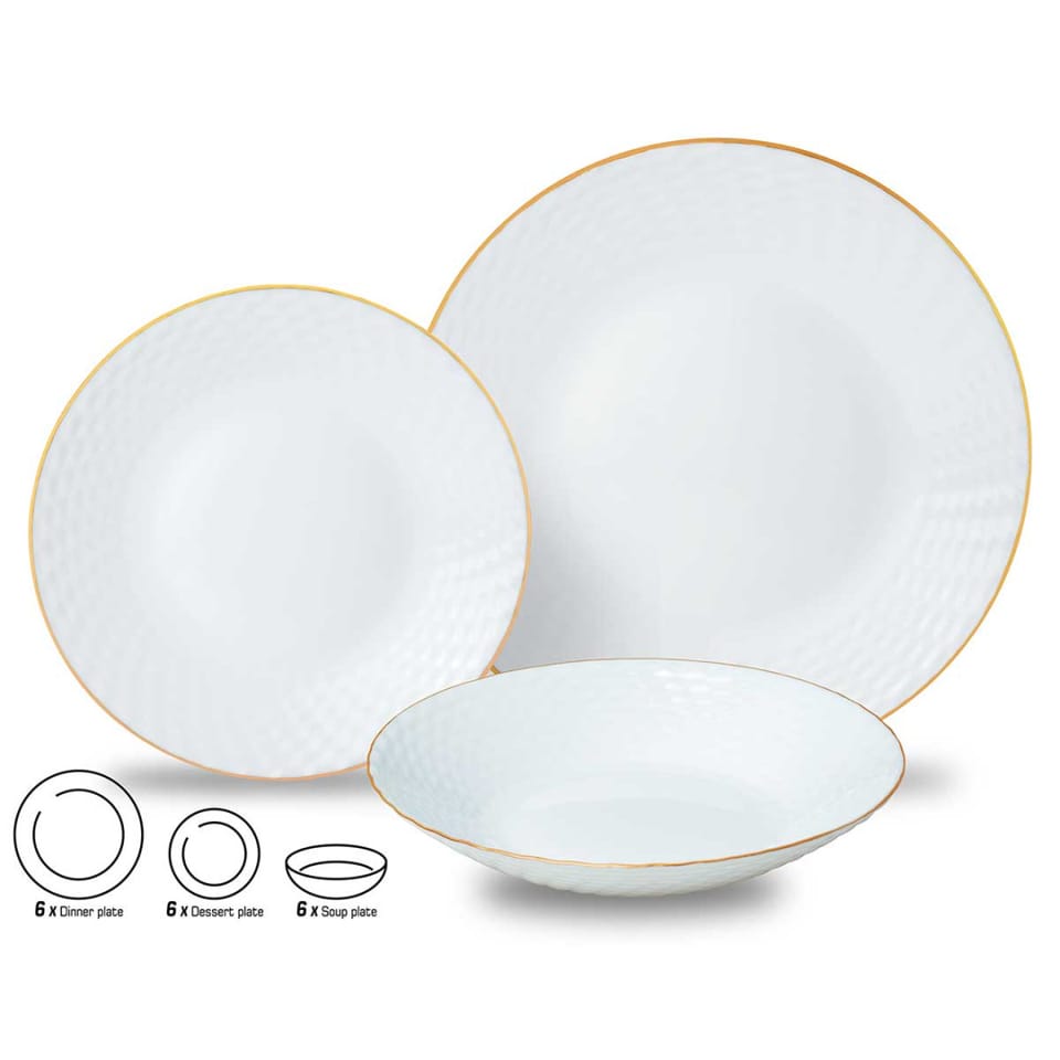 - Kompletny zestaw dla 6 osób – zestaw składa się z 18 elementów, które obejmują: 6 talerzy obiadowych o średnicy 25,4 cm 6 talerzy deserowych o średnicy 19 cm 6 talerzy do zupy o średnicy 20,3