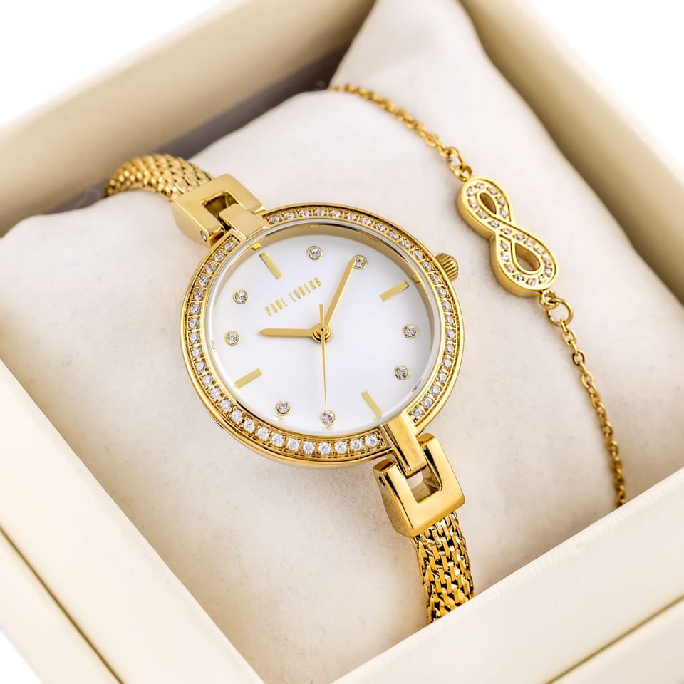 Komplet prezentowy damski, który zachwyca swoją elegancją, delikatnością i ponadczasowym stylem. Zawiera zegarek ze stali szlachetnej marki Paul Lorens w kolorze złotym, z piękną tarczą w kolorze białym, która subtelnie podkreśla jego klasyczny charakter. Złota koperta zegarka, ozdobiona błyszczącymi cyrkoniami, dodaje całości wyjątkowego blasku. Zegarek charakteryzuje się także wodoszczelnością WR30, co sprawia, że jest praktyczny i funkcjonalny. Do kompletu dołączona jest kobieca bransoletka w kolorze złotym, która perfekcyjnie komponuje się z zegarkiem. To idealny wybór na prezent – elegancki, piękny i niezapomniany.
