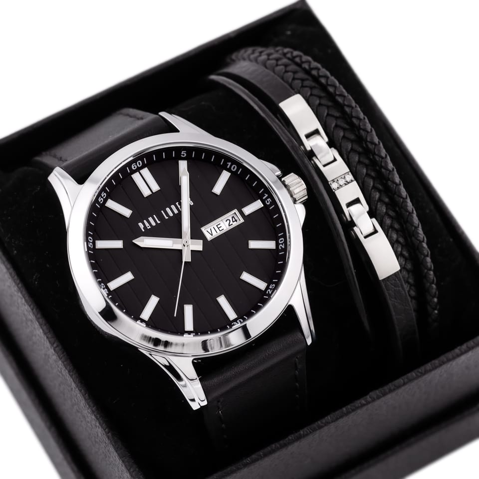 Komplet prezentowy męski, który łączy elegancję z ponadczasowym stylem. Zawiera zegarek marki Paul Lorens, na czarnym pasku, z klasyczną, czarną tarczą ozdobioną indeksem w kolorze srebrnym, co nadaje mu subtelną i wyrafinowaną estetykę. Koperta zegarka w kolorze srebrnym doskonale komponuje się z całością, tworząc wyjątkowy design. Zegarek charakteryzuje się wodoszczelnością WR30, co zapewnia jego funkcjonalność i trwałość. Komplet zawiera również skórzaną, czarna bransoletę z elementamisrebrnymi, która stanowi doskonałe uzupełnienie całości. To idealny wybór na święta – elegancki, męski i wyjątkowy prezent, który zachwyci każdego.