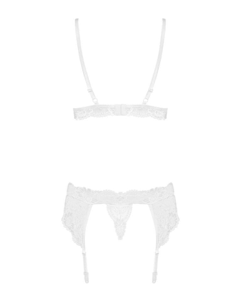 Biel w najlepszym wydaniu - oto 3-częściowy, mega seksowny komplet bielizny: biustonosz, stringi i pas wykonane z eleganckiej, elastycznej koronki. Biustonosz o trójkątnych miskach, bez fiszbin, usztywniany - idealnie zbierze i wymodeluje piersi. Ramiączka regulowane. Na plecach zapięcie. Stringi perfekcyjnie pasują do całości. Pas o troczkach bez możliwości odpięcia, ich długość możesz regulować. Pończochy nie należą do zestawu. Skład: 90% poliamid, 10% elastan.