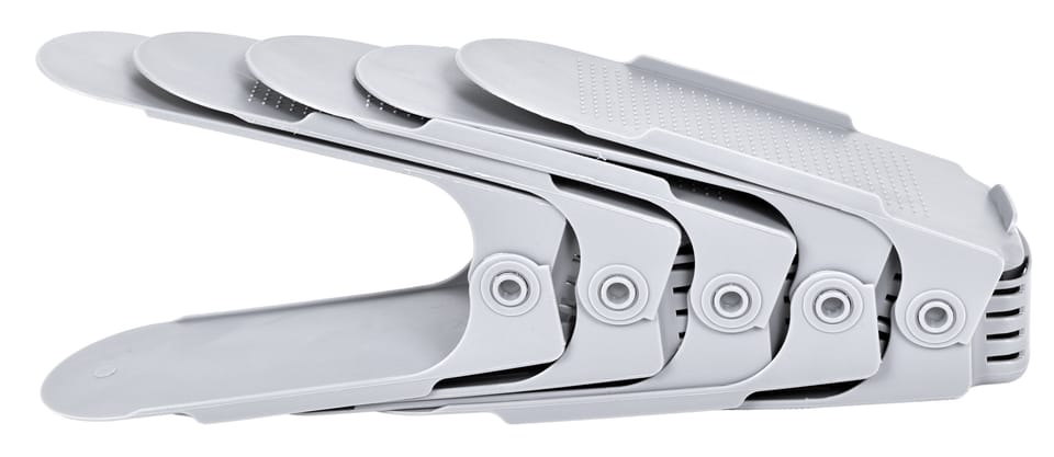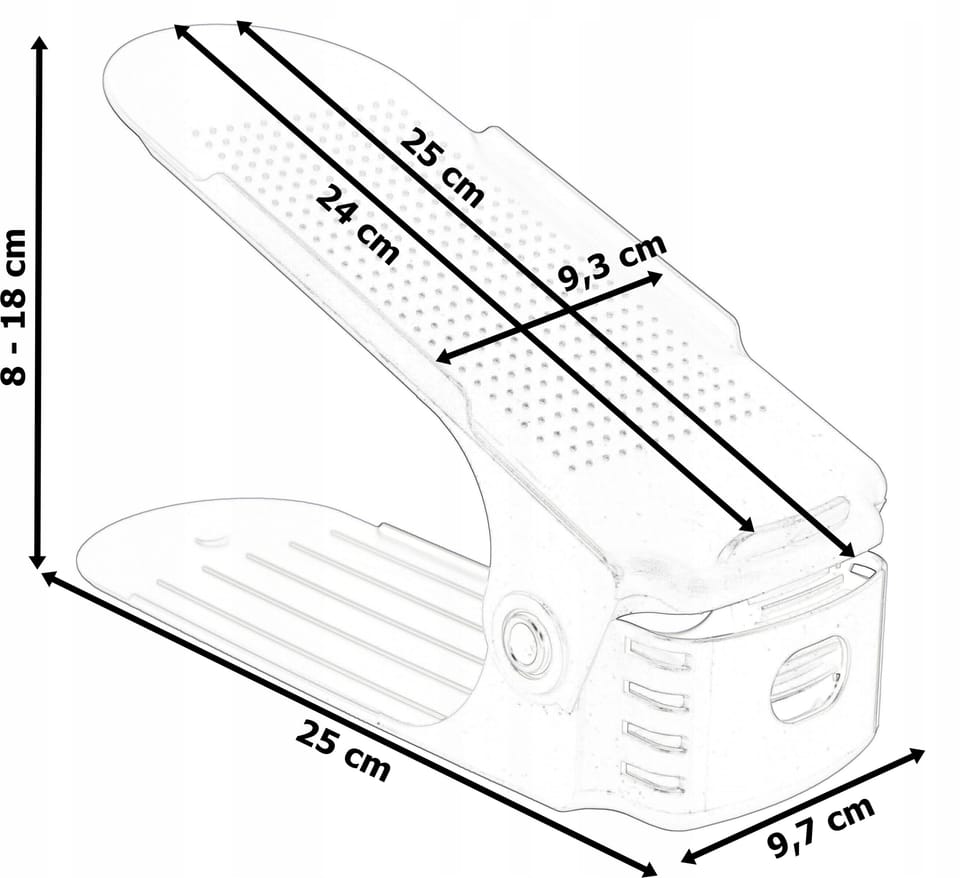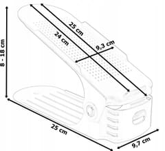 Regulowany organizer uchwyt stojak na buty szary 10 sztukPrzeznaczenie: porządkowanie obuwia | Kolory: szary Uchwyt pasuje do wszystkich rodzajów obuwia - adidasów, szpilek itd. Zajmując niewiele miejsca, znacznie zwiększa przestrzeń do przechowywania, dzięki układaniu butów jeden na drugi. Świetnie nadaje się do organizowania obuwia całej rodziny. Cechy produktuDo wszystkich rodzajów obuwiaWykonany z wytrzymałego i elastycznego tworzywa sztucznegoDzięki organizerowi buty nie brudzą się poprzez układanie ich na sobieLekka konstrukcjaOszczędność miejsca o 50%Powierzchnia antypoślizgowaOgranicznikPraktyczny uchwyt4 stopniowa regulacja10 sztuk w komplecie Wymiary produktuDługość całkowita 25 cmSzerokość całkowita 9,7 cmWysokość całkowita 18 cm 4-ro stopniowa regulacja!Poziom 1 - 8 cmPoziom 2 - 11 cmPoziom 3 - 15 cmPoziom 4 - 18 cm Pamiętaj o segregacji odpadów!Informacje dodatkowePrzedstawione kolory należy traktować poglądowo - mogą odbiegać od rzeczywistych ze względu na różne ustawienia monitorów oraz proces obróbki zdjęć. Rzeczywiste wymiary mogą się różnić od podanych wyżej. Tolerancja błędów może wynosić +/- 5%. Marka:GMM GroupKod produktu:KPL REG UCH BUT SZARKod EAN:5902340319659Kolor:szaryWysokość: 18 cmDługość:25 cmSzerokość:9,7 cmRegulacja poziomów:4 poziomy