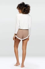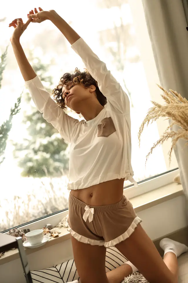 Dwuczęściowy komplet, który sprawdzi się zarówno w roli piżamki jak i homewara. Wykonany z przyjemnej w dotyku wiskozy. Bluzka z długim rękawem, zdobiona kieszonką na piersi. W dolnej części bluzki znajduje się tunel ze wstążką, którą można zawiązać na kokardkę. Szorty z uroczą falbanką wokół ud. Kolorystyka cappucino połączona ze słodkim ecru, bardzo ładna. Dzianina miękka, przyjemna w dotyku. Skład: 92% wiskoza, 8% elastan.