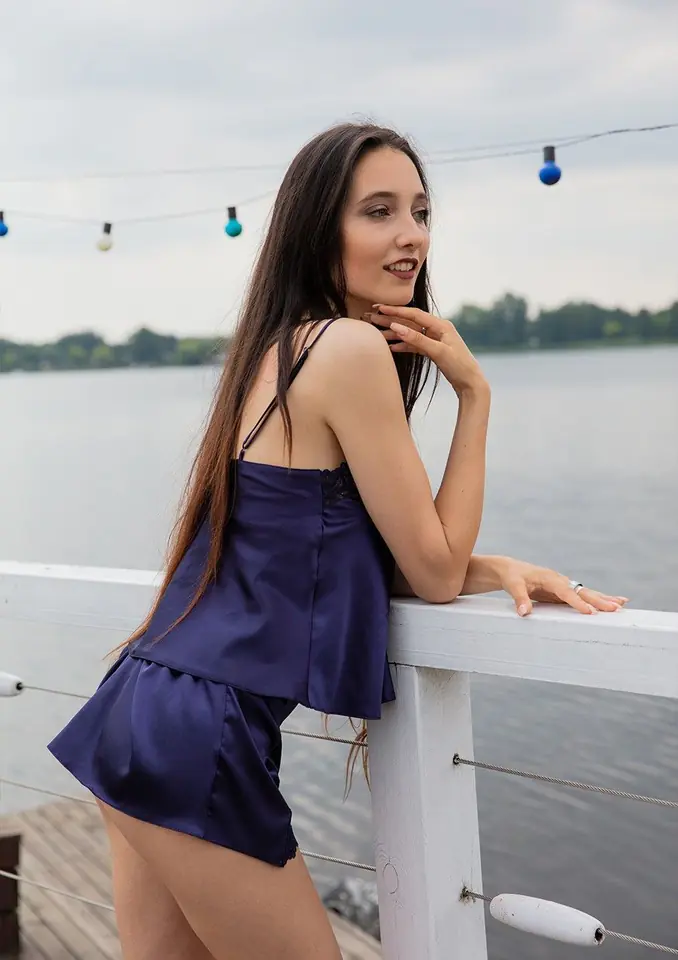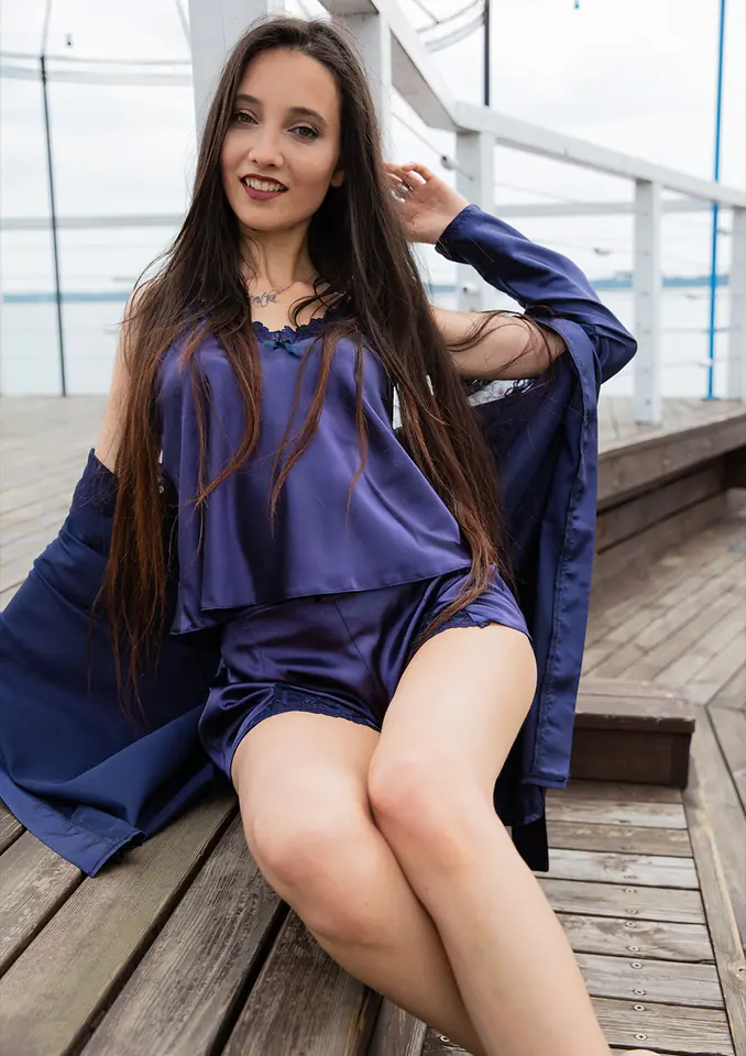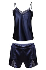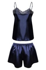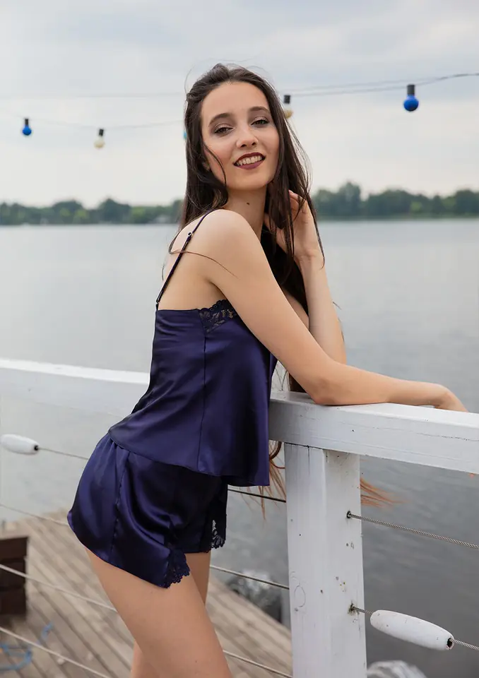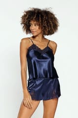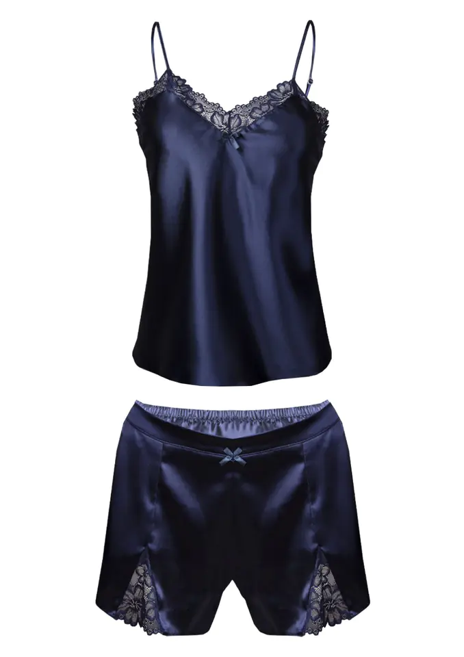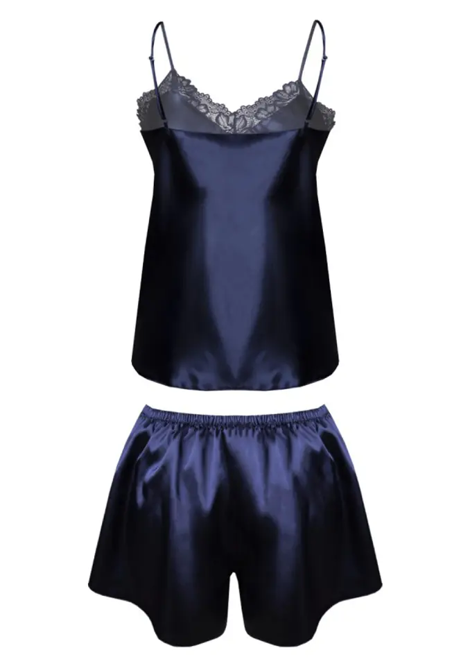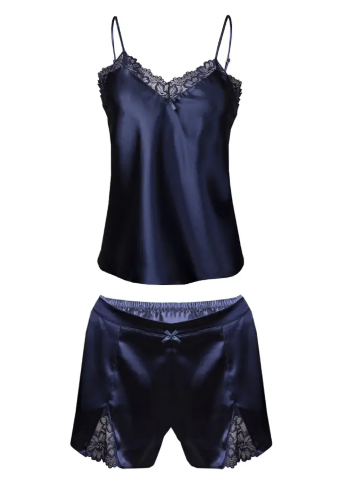 Elegancki, dwuczęściowy komplet wykonany z granatowej satyny i czarnej koronki. Z pewnością oczaruje Cię zarówno swym wyrafinowanym kolorem jak i niesamowitą subtelnością wpisaną w ten projekt. Komplecik składa się z wygodnej bluzeczki na cienkich, regulowanych ramiączkach, z pięknym, koronkowym dekoltem oraz luźnych szortów na miękkiej gumce, z koronką jako wstawką na udach. Skład: 100% poliester.
