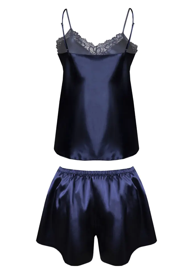 Szukasz nowego i stylowego sposobu na spędzanie czasu w domu? Nie szukaj dalej niż nasza kolekcja piżam damskich! Wykonane z luksusowych tkanin i w wielu modnych stylach, te piżamy są idealne do relaksu w domu lub do złapania odrobiny snu. Dlaczego więc nie sprawić sobie przyjemności i nie otulić się przytulną piżamą damską już dziś?Kuś swojego mężczyznę na każdym kroku, mając na sobie seksowny Komplet Samantha. Komplecik ten składa się ze zwiewnej koszulki na cieniutkich ramiączkach oraz luźnych spodenkach na elastycznej gumce. Góra koszulki obszyta jest granatową koronką w kwiatowy wzór. Na środku biustu oraz na górze spodenek doszyta jest malutka, urocza kokardka. Ramiączka koszulki posiadają możliwość regulowania, dzięki czemu każda kobieta może dopasować ją do swoich kształtów. Spodenki posiadają trójkątne koronkowe wstawki - znajdują się one z przodu na nogawkach. Komplet Samantha dostępny jest w granatowym kolorze. Czy jest to komplecik, którego szukasz? Jeśli tak, zachęcamy do dokładniejszego zapoznania się z naszą ofertą oraz tabelą z rozmiarówką. Podkreśl swoją kobiecość z bielizną nocną od Dkaren.