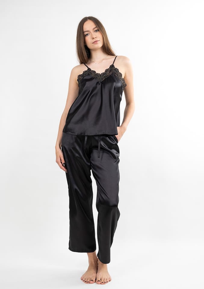Komplet Tila to wyjątkowa propozycja dla kobiet, które cenią sobie zarówno styl, jak i komfort. Wykonany z delikatnej, czarnej satyny komplet stanowi idealne połączenie zmysłowości i praktycznego zastosowania. Piżama składa się z dwóch elementów: lekkiej koszulki na cienkich ramiączkach oraz wygodnych, luźnych spodni o prostym kroju. To doskonały wybór zarówno na spokojne wieczory w domowym zaciszu, jak i na wyjątkowe chwile relaksu, w których chcesz poczuć się wyjątkowo i kobieco.