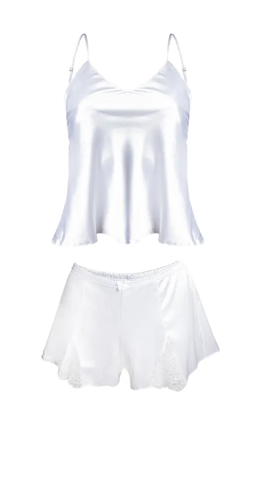 Seksowny komplet który składa się z krótkiej koszulki oraz spodenek z delikatną koronką. Ramiączka cienkie regulowane. Komplet w odcieniu bieli.