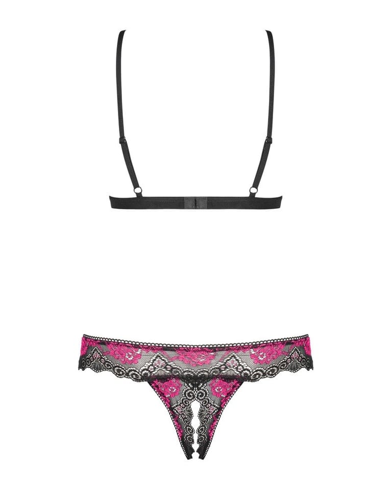 Zachwycająca, czarno-różowa bielizna z linii Tulia, z biustonoszem o otwartych miseczkach i stringami typu open. Niezwykle seksowna, a jednocześnie o wyjątkowym, koronkowym wdzięku. Co oferuje ta bielizna? Regulowane ramiączka, kilkustopniowe zapięcie biustonosza, miękkie wykończenia i śliczny, kwiecisty dekor w połączeniu z niezwykle zmysłową konstrukcją. Skład: 90% poliamid, 10% elastan.