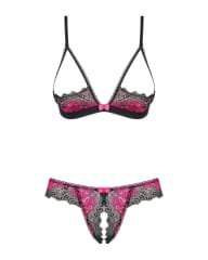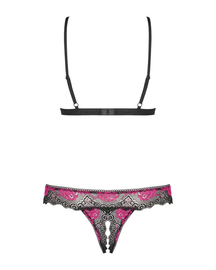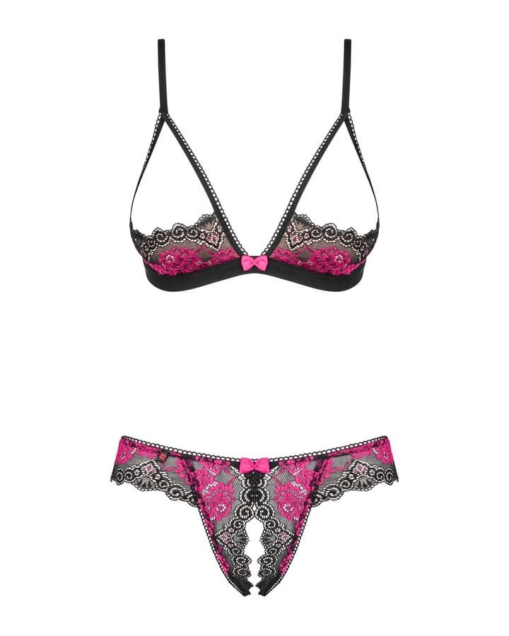 Zachwycająca, czarno-różowa bielizna z linii Tulia, z biustonoszem o otwartych miseczkach i stringami typu open. Niezwykle seksowna, a jednocześnie o wyjątkowym, koronkowym wdzięku. Co oferuje ta bielizna? Regulowane ramiączka, kilkustopniowe zapięcie biustonosza, miękkie wykończenia i śliczny, kwiecisty dekor w połączeniu z niezwykle zmysłową konstrukcją. Skład: 90% poliamid, 10% elastan.