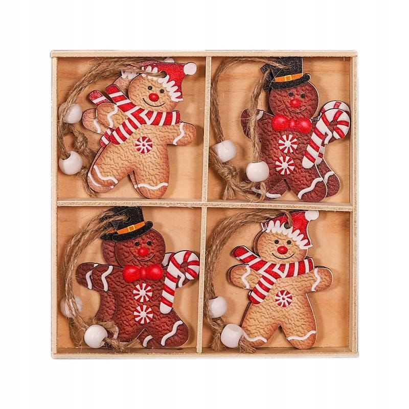 Komplet zawieszek choinkowych PIERNICZKI 12 sztukDodaj swojemu wnętrzu odrobinę zimowej magii.Pierniczki nadają się jako ozdoba świąteczna do powieszenia na oknie, choince lub jako prezent.Cudowny i praktyczny dodatek do twojego wnętrza. Tymi zawieszkami udekorujesz świąteczne drzewo jak i stroiki czy okna. Specyfikacja:Zestaw 12 sztukZapakowane w drewniane pudełko Materiał: DrewnoWymiary 1 zawieszki:6,5 x 5 cmWymiary pudełka:14 x 14 cmWaga zestawu:67g brutto Poczuj klimat świąt!
