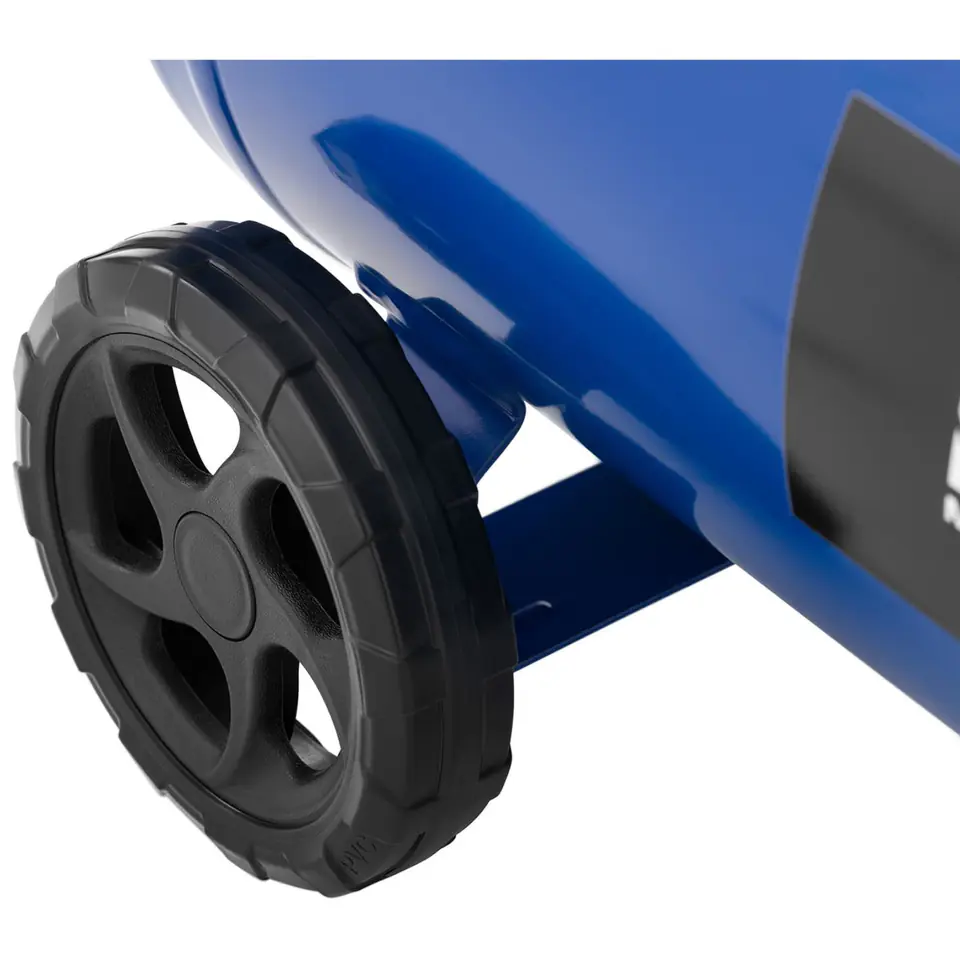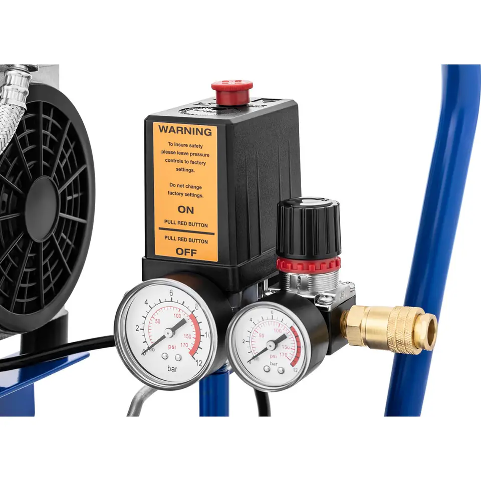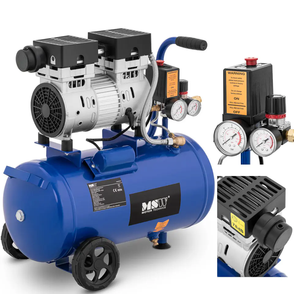 Kompresor bezolejowy marki MSW to idealny sprzęt do pompowania kół, materacy, piłek czy pontonów, czyszczenia zakamarków i napędzenia narzędzi pneumatycznych. Duża wydajność urządzenia wynika z zastosowania silnika o mocy 750 W (1 KM) i bezolejowego kondensatora osiągającego prędkość nawet 1400 obr./min. Obszerny zbiornik maszyny ma pojemność 24 l (6,3 gal). Posiada on grube ścianki (2,5 mm) gwarantujące bezpieczeństwo i zmniejszające ryzyko uszkodzenia sprzętu. Wyposażono go też w specjalny zawór do spuszczania nagromadzonej wody. Maksymalne ciśnienie robocze do 8 bar. Inteligentny włącznik uruchamia pompę, gdy wartość spadnie do 6 bar, a następnie wyłącza urządzenie po osiągnięciu 8 bar. Przed zbyt wysokim ciśnieniem chroni specjalny zawór. Mobilność to zasługa kółek o średnicy 125 mm i dwóch uchwytów. Pierwszy z nich ma gumową nakładkę i służy do manewrowania sprężarką, a drugi do podnoszenia sprzętu z podłoża. Stabilność zapewnia noga, która redukuje wibracje i nie uszkadza powierzchni roboczej.