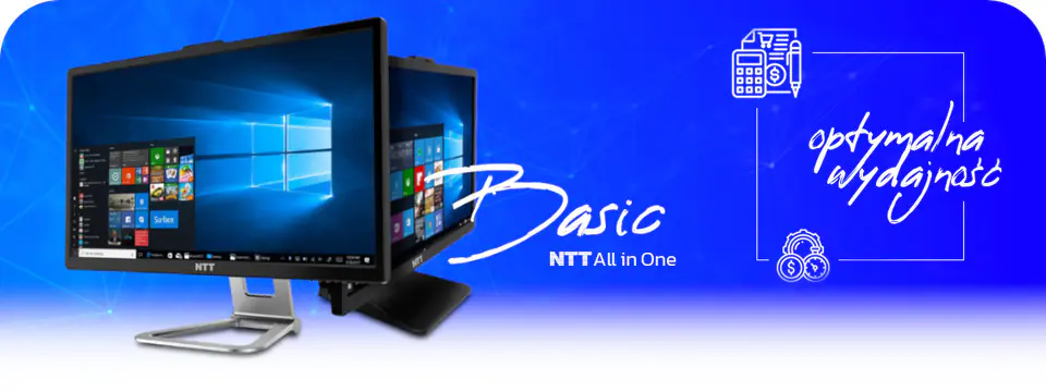 W komputerach NTT All in One z linii „Basic” znajdziesz popularne procesory z czterema i sześcioma rdzeniami z serii Intel® Core™ i3, i5 oraz AMD® Ryzen™ 3, 5. Oferują one wysoką wydajność w programach z pakietu Microsoft Office, oprogramowaniu księgowym, bazach danych, oprogramowaniu do wykonywania rozszerzonych obliczeń, a także w pełni płynne przeglądanie zasobów internetu. Zintegrowane karty graficzne umożliwiają w pełni sprawną obsługę multimediów (filmów, zdjęć, muzyki), oraz podłączenie więcej niż jednego monitora do zestawu komputerowego. Zestawy NTT AiO „Basic” to właściwy wybór do domowego miejsca pracy, a także do każdego, stanowiska biurowego w Twojej firmie.