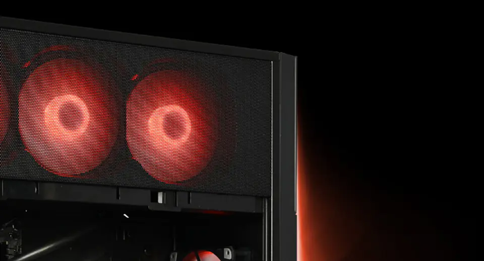 Wnętrze obudowy wyposażone w maksymalną ilość wentylatorów RGB, dbających o jak najlepszy przepływ powietrza i odprowadzanie ciepła z podzespołów. Rozszerzone chłodzenie procesora, gwarantujące znacznie wyższe możliwości niż standardowy system chłodzący. Zwiększ taktowanie procesora w łatwy sposób, przekraczając granicemożliwości większości komputerów gamingowych.