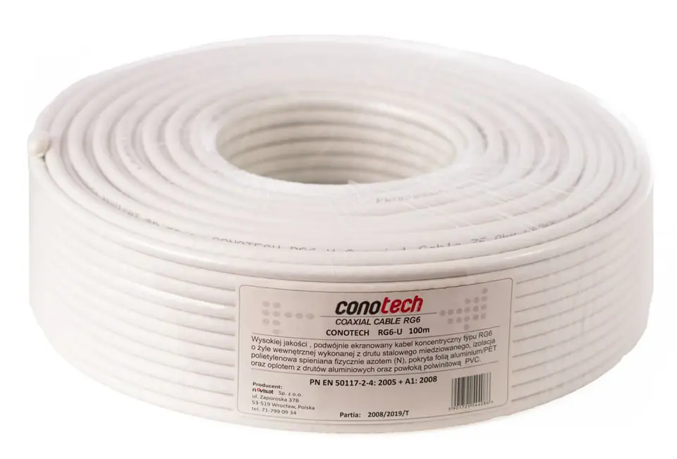 Podwójnie ekranowany kabel koncentryczny typu RG6, o żyle wewnętrznej wykonanej z drutu stalowego miedziowanego o średnicy 1,02 mm. Przewodnik został otulony polietylenem spienianym fizycznie azotem (N), cechującym się szczególnie skuteczną izolacją dielektryczną. Ekranowanie przewodu wykonane jest zgodnie ze standardem, w którym stosuje się podwójne zabezpieczenie rdzenia, składające się z warstwy folii aluminiowej AL/PET, oplotu aluminiowego o współczynniku pokrycia 75%. Powłoka zewnętrzna wykonana jest z polwinitu (PCV) w kolorze białym, o średnicy 6,8 mm, która pełni funkcję ochronną przed uszkodzeniami mechanicznymi oraz umożliwia szybkie i komfortowe prowadzenie kabla.