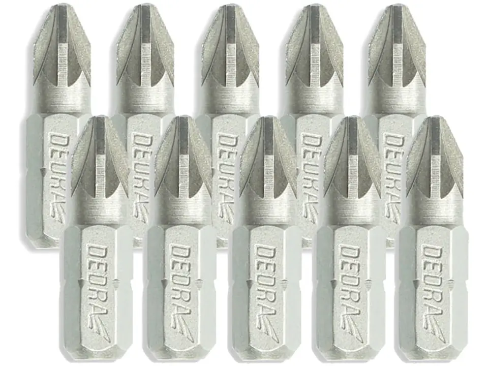 Dziesięć końcówek wkrętakowych, krzyżakowych PZ, marki Dedra.