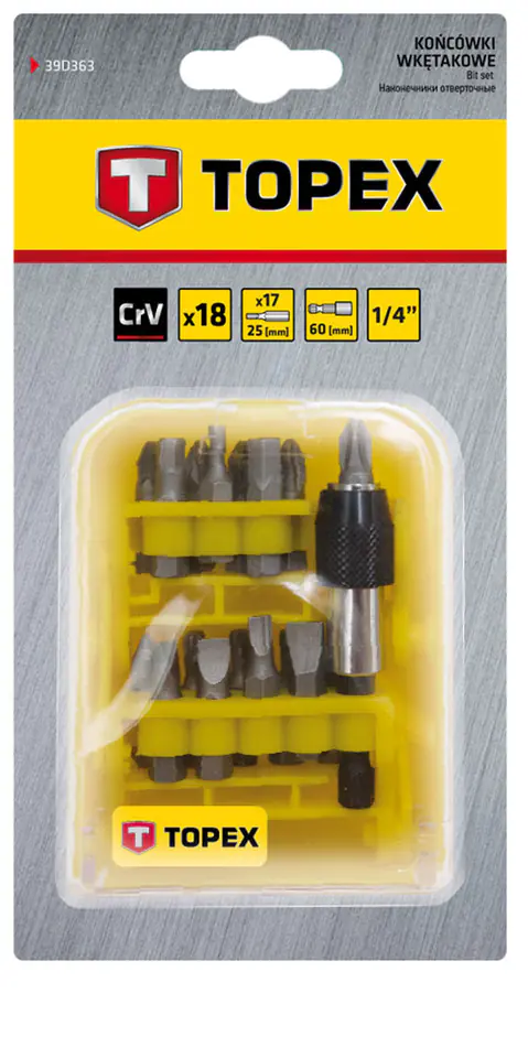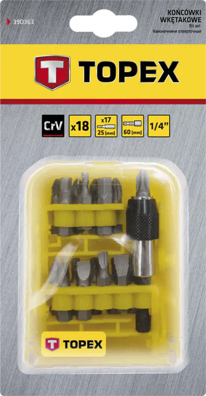 Końcówki wkrętakowe z uchwytem, zestaw 18 szt., uchwyt 1/4", 60 mm, 17 szt. końcówek wkrętakowych 25 mm, rozmiary: płaskie 4, 5, 6, 7 mm, krzyżowe PH1, PH2, PH3, PZ1, PZ2, PZ3, Torx T10, T15, T20, T25, sześciokątne H3, H5, H6, stal CrV, etui z tworzywa