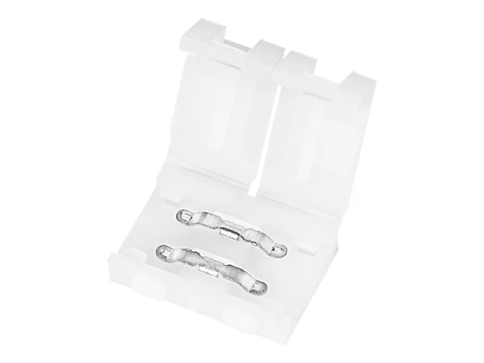 Złącze taśmy LED pozwala na szybkie łączenie dwóch taśm LED o szerokości 8mm bez konieczności lutowania. Bardzo cienka budowa na instalację w praktycznie każdym miejscu, prosty i szybki montaż - wystarczy włożyć taśmę w szczelinę i zacisnąć element zabezpieczający.