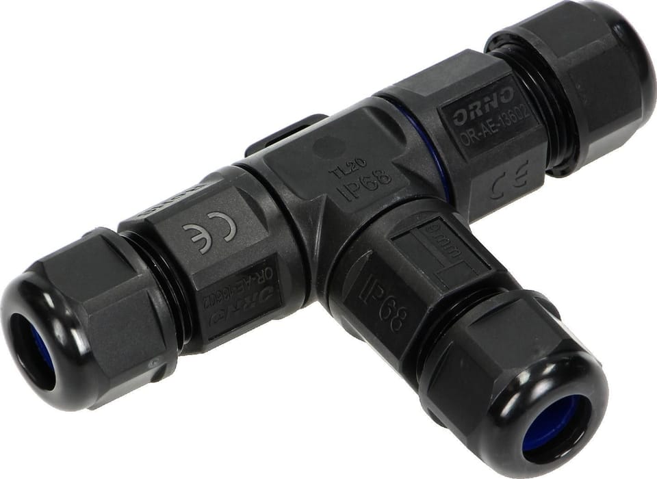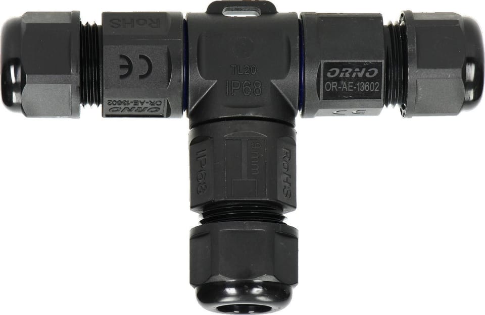 MINI konektor kablowy w formie trójnika ma bardzo małe rozmiary. Wysoki stopień szczelności IP68 zabezpiecza przed działaniem czynników zewnętrznych, a nowatorskie uszczelnienie O-Ringiem nie naraża uszczelnienia na niszczące warunki zewnętrzne,chemiczne i mechaniczne. Materiał użyty do produkcji konektora jest odporny na działanie promieni UV i nadaje się do stosowania na zewnątrz. Sztywna i zbita konstrukcja, oraz nowatorskie uszczelnienie, umożliwia montaż w gruncie . Styki zostały wykonane z mosiądzu, dodatkowo zabezpieczonego przed utlenianiem warstwą niklu. Dławica wyposażona została w grubą uszczelkę, która dokładnie uszczelnia wprowadzone przewody.