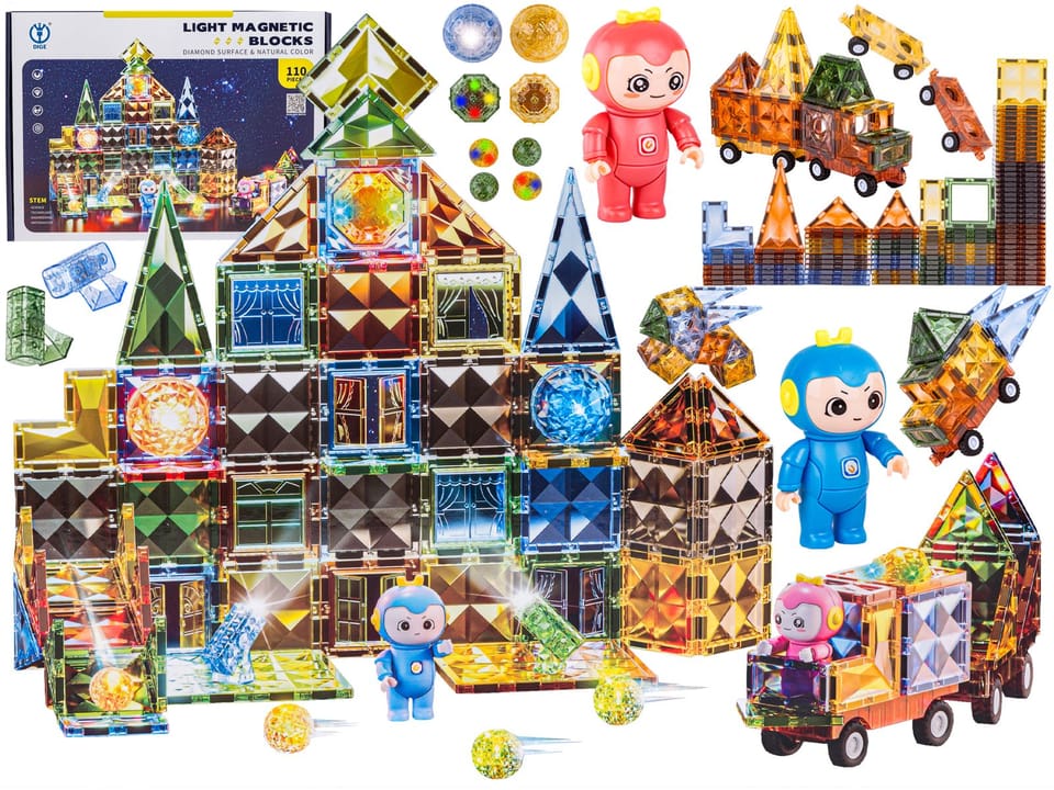 Konstrukcyjne Klocki Magnetyczne Świecące Elementy + Pojazdy 110 El.