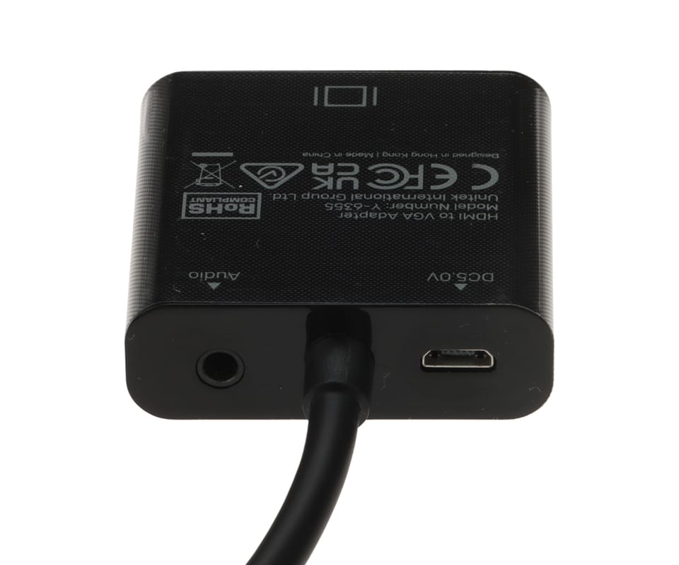 Y-6355 to adapter HDMI do VGA marki UNITEK z wyjściem audio 3.5 mm, umożliwiający jednoczesne przesyłanie obrazu i dźwięku do starszych monitorów oraz projektorów. Obsługuje rozdzielczość do 1080p UXGA i współpracuje ze złączami standard HDMI, Mini HDMI oraz Micro HDMI. Kompaktowa obudowa, opcjonalne zasilanie przez Micro USB i plug-and-play ułatwiają użycie w domu, biurze i podczas prezentacji.