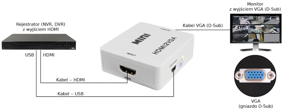 - Przeznaczenie: Konwerter HDMI-VGA pozwala na podłączenie urządzeń tj. rejestratory telewizji przemysłowej (DVR, NVR) wyposażonych w gniazda HDMI do monitorów wyposażonych jedynie w wejście VGA (D-Sub)