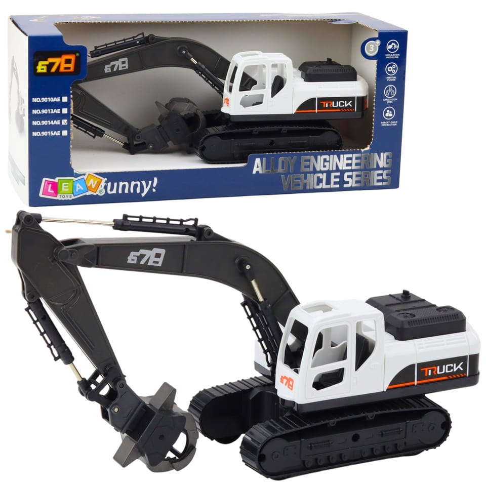 Wyposażona w chwytak zamiast klasycznej łyżki, posiada przegubowe ramię z wieloma punktami ruchu oraz możliwość pełnego obrotu podstawy o 360°. Gąsienicowe podwozie nadaje modelowi stabilności i masywnego wyglądu, jak w prawdziwej maszynie budowlanej. Model w stonowanej kolorystyce biało-czarno-szarej wyróżnia się nowoczesnym, przemysłowym designem.
