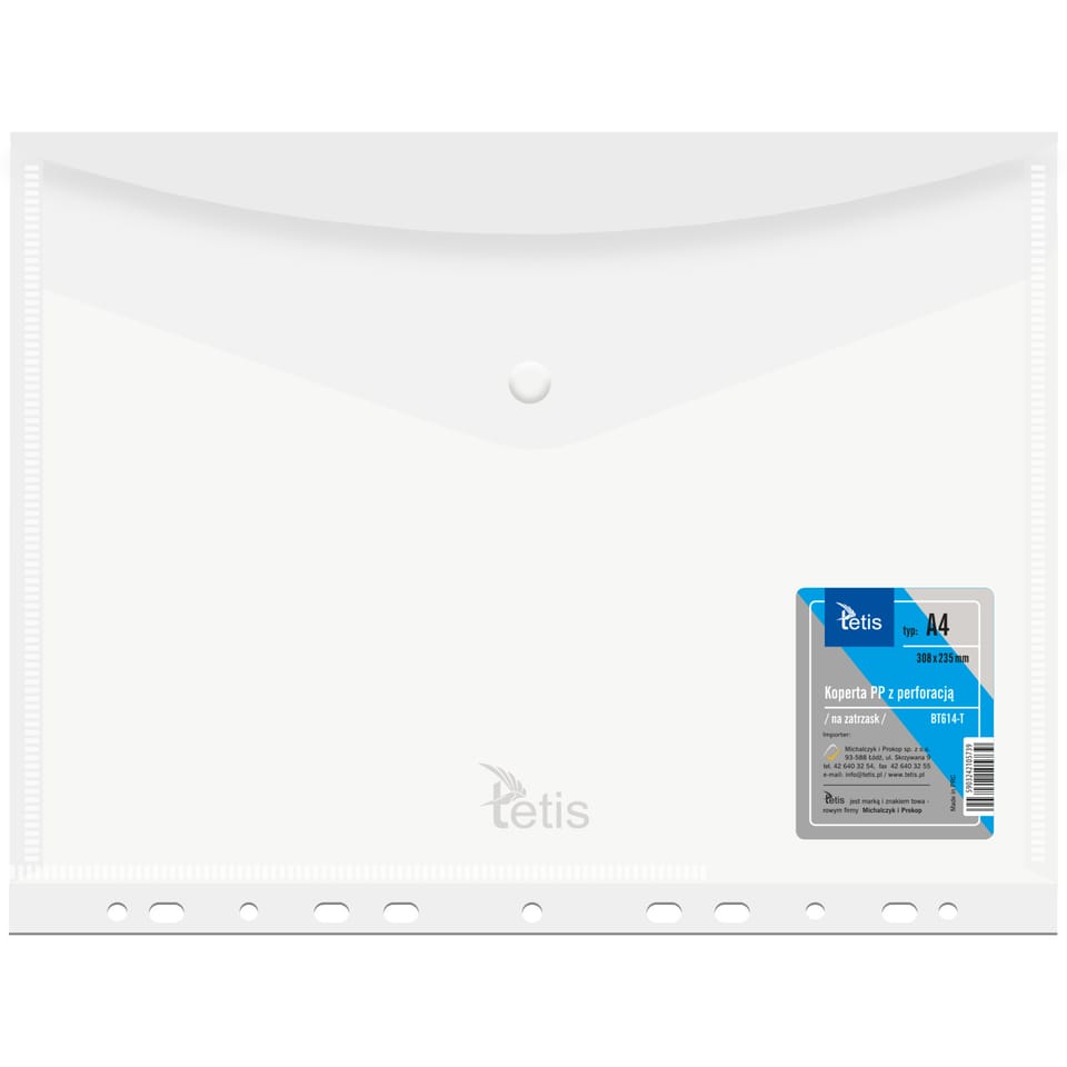 Koperta A4 PP na zatrzask z perforacją TRANSPARENTNA BT614-T TETIS Koperta PP na zatrzask z europerforacją, mieszcząca format A4.