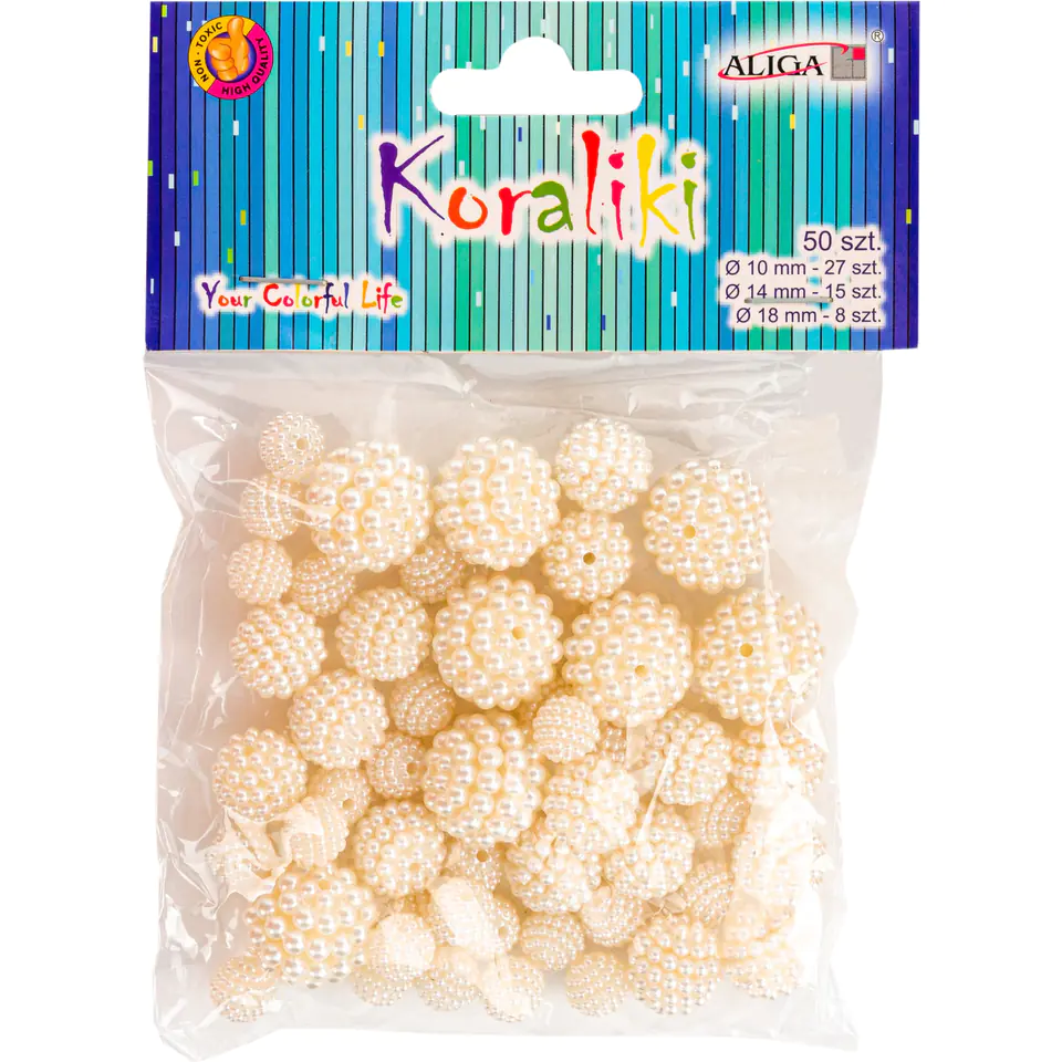Koraliki plastikowe, perłowe Opakowanie zawiera 50szt. 10mm, otwór 2mm - 27szt. 14mm, otwór 2mm - 15szt. 18mm, otwór 2mm - 8szt.