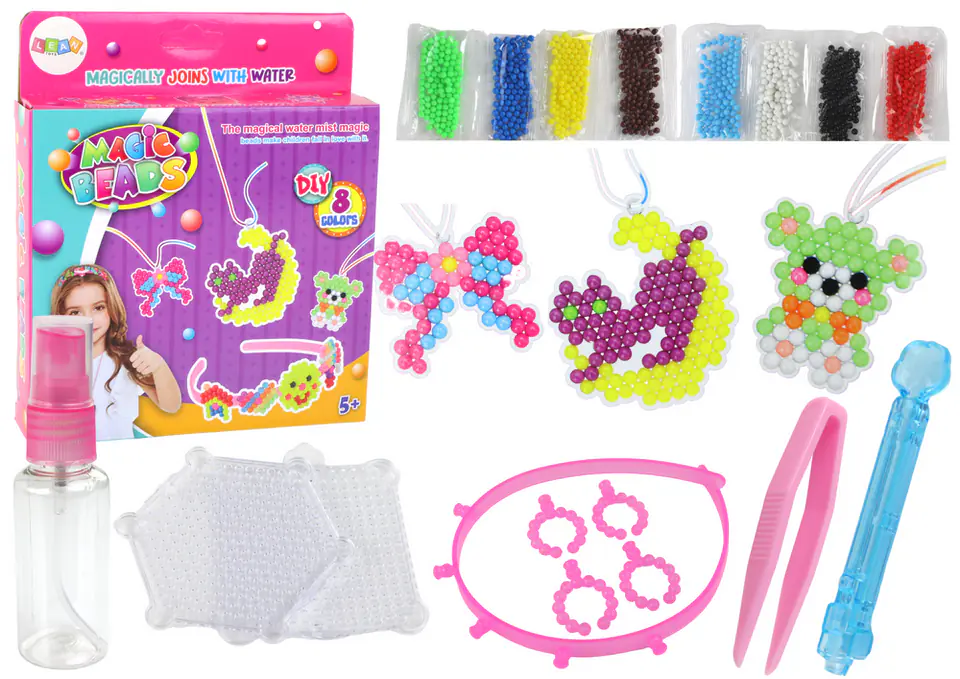 - Koraliki w 8 kolorach- Podkładkę kwadratową i sześciokątną- 1 pęsetę- 1 aplikator- 1 spryskiwacz- Akcesoria do zrobienia biżuterii - przepaska i kolorowe sznureczki - Książeczkę z przykładowymi wzorami- Oryginalne opakowanie