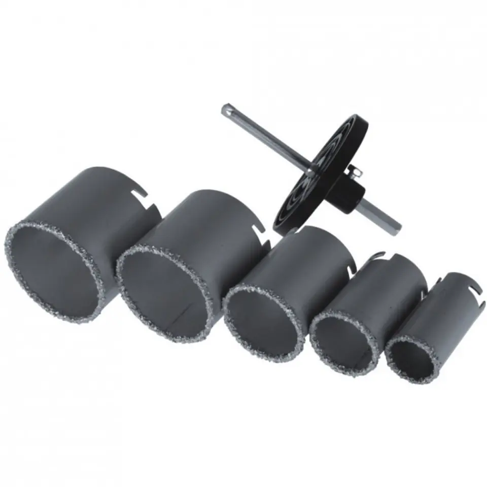 DED1517 - wycinacz z nasypem węglika wolframu W zestawie: korony o średnicy (mm): 33 43 53 67 73 tarcza wycinacza zamienna wiertło pilot zamienneWaga: 0,756 kg