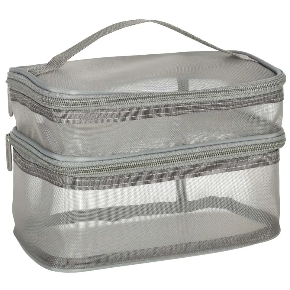 Praktyczna kosmetyczka podróżna – to must-have podczas każdej podroży. Dzięki dwupoziomowej konstrukcji umożliwia zorganizowanie kosmetyków. Jest zapinana na dwustronny zamek błyskawiczny. Wykonana z siateczkowego materiału ułatwiającego znalezienie schowanych produktów. Posiada praktyczną rączkę dla wygodnego przenoszenia.