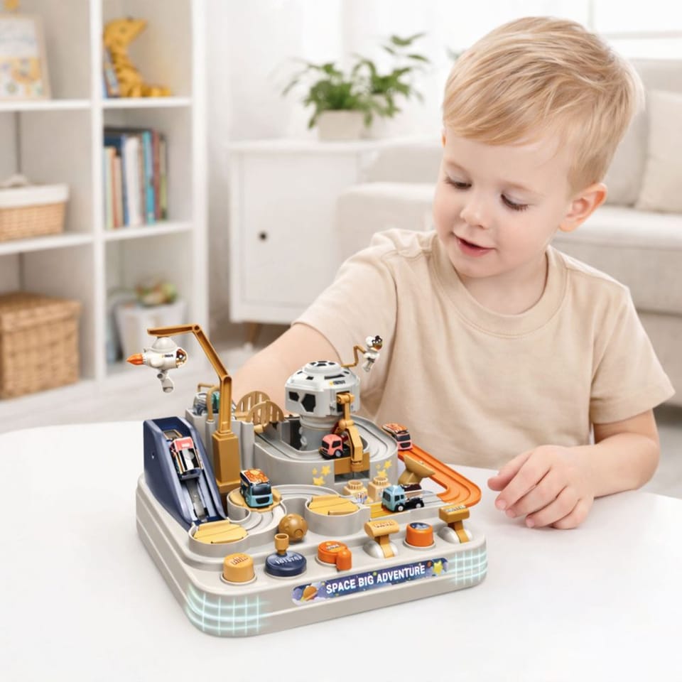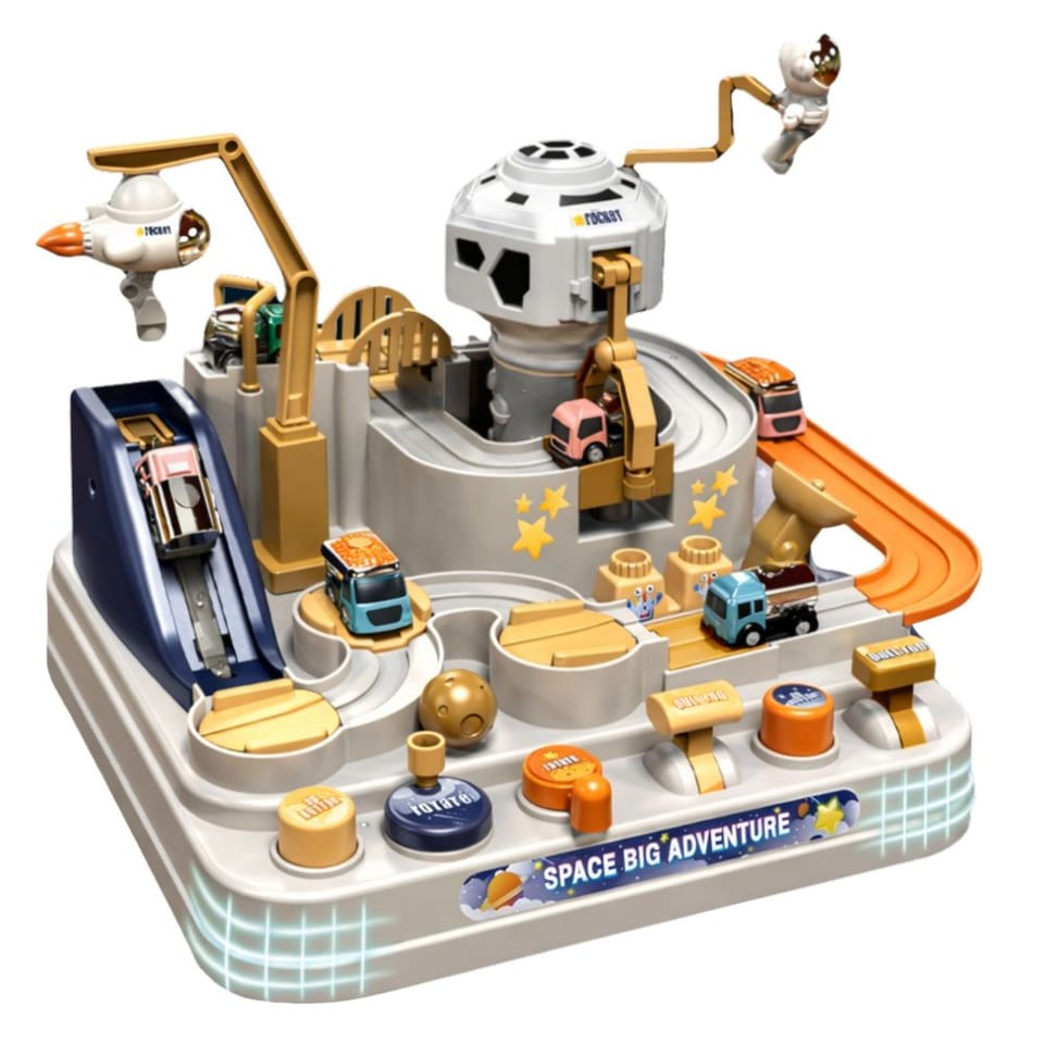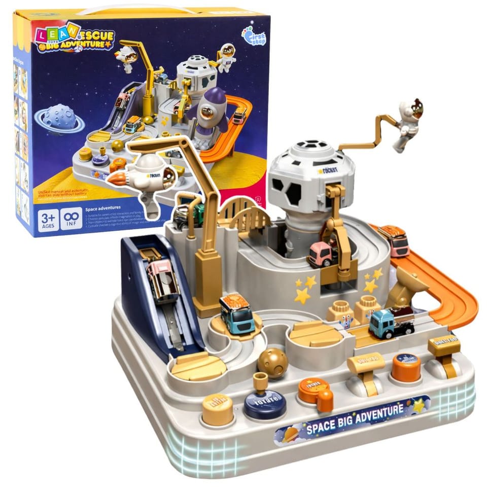 Oto niesamowity, wielofunkcyjny kosmiczny tor interaktywny, który nie tylko zachwyca swoją konstrukcją i jakością wykonania, ale także aktywnie wspiera rozwój dziecka. To prawdziwa kosmiczna baza pełna przygód, w której mali odkrywcy znajdą aż 10 różnych mechanicznych aktywności – wszystkie obsługiwane ręcznie, bez potrzeby użycia baterii. Wśród funkcji znajdują się m.in. wyrzutnie rakiet, ruchome dźwigi, zjeżdżalnie, windy, tunele, zapadnie, obrotowe platformy i kolorowe przyciski, które uruchamiają kolejne elementy układu.